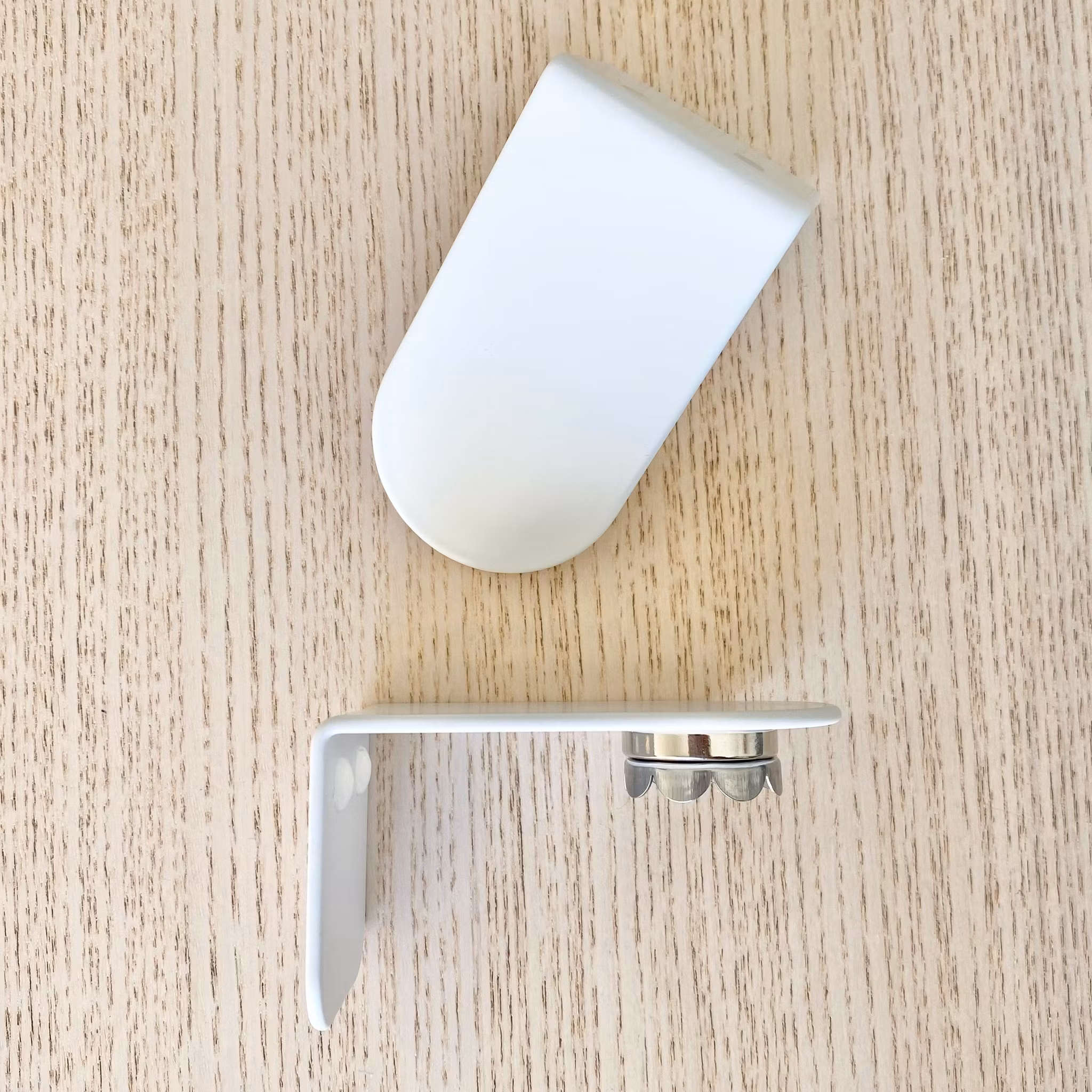 Tvålupphängare i metall som fästs på väggen med en medföljande dubbelhäftande tejp eller medföljande skruvar. En magnet trycks in i tvålen och sedan kan tvålen fästas till upphängaren.