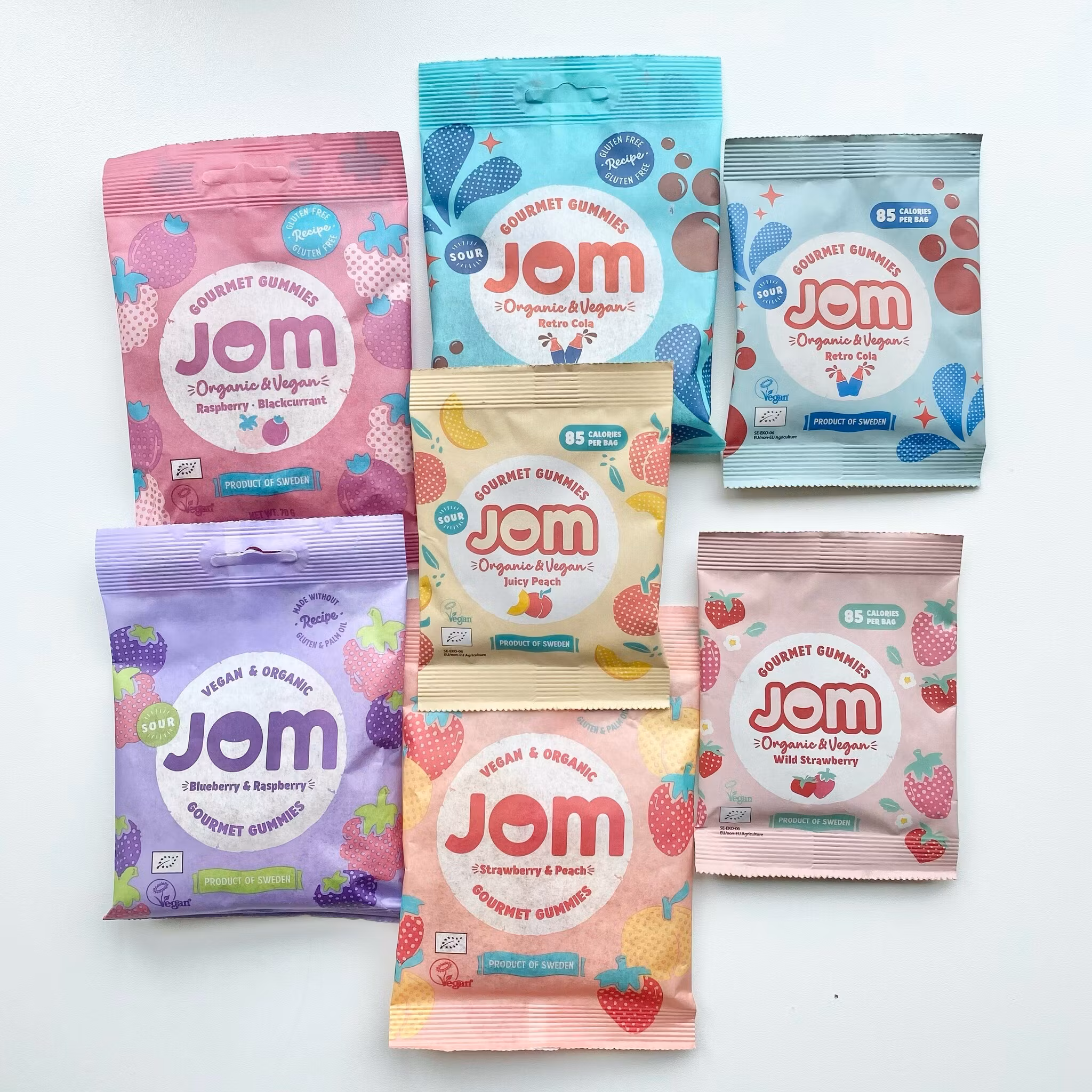 Om: Jom vill att det ska vara enkelt att göra bättre och sundare val i vardagen, även när det kommer till godishyllan. Flexitarian, vegan eller bara superb – JOM är det nya medvetna godiset där gelatin, gluten och palmolja är ett minne blott. Det är lätt att sträcka sig efter ”Just One more” (därav namnet JOM), och med endast ekologiska och veganska råvaror blir planeten också extra glad.