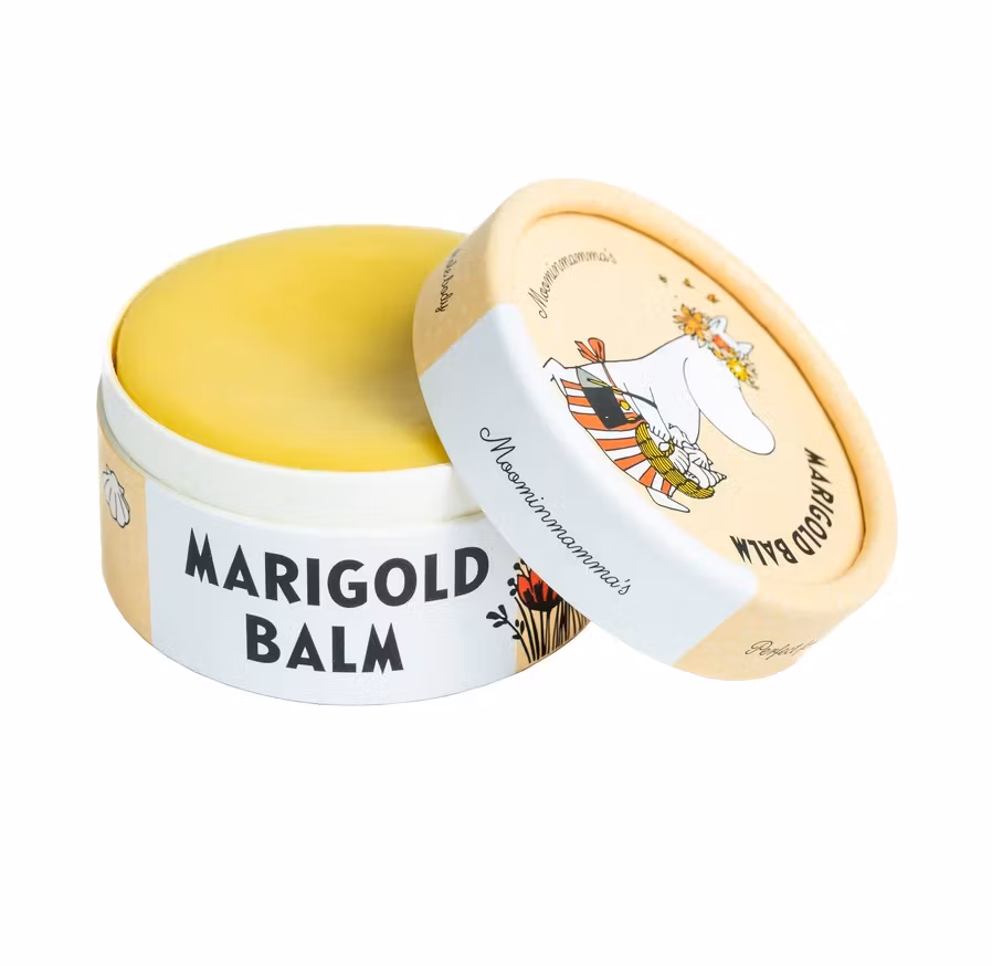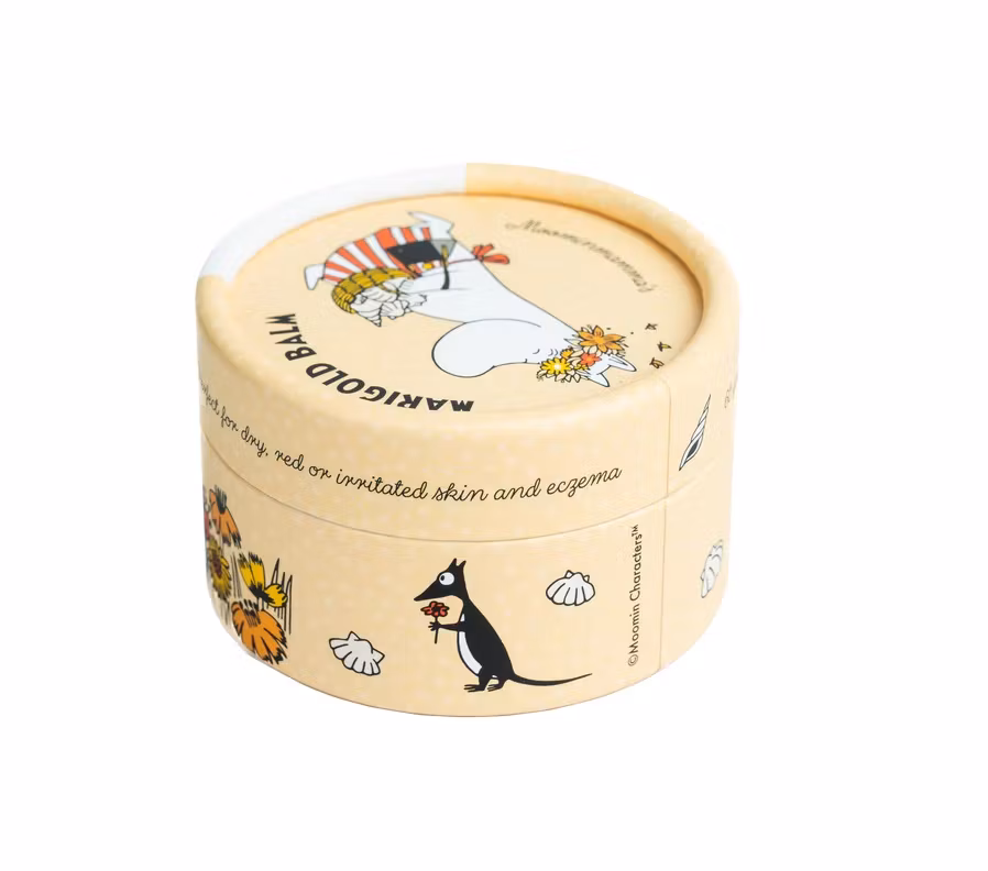 Ringblomssalvan kommer i en högtålig och miljövänligare pappförpackning i vacker design med Muminmotiv av Muminmamman. Varje salva är tillverkad för hand med omsorg på Gotland av ett litet familjeföretag med passion för hållbarhet.