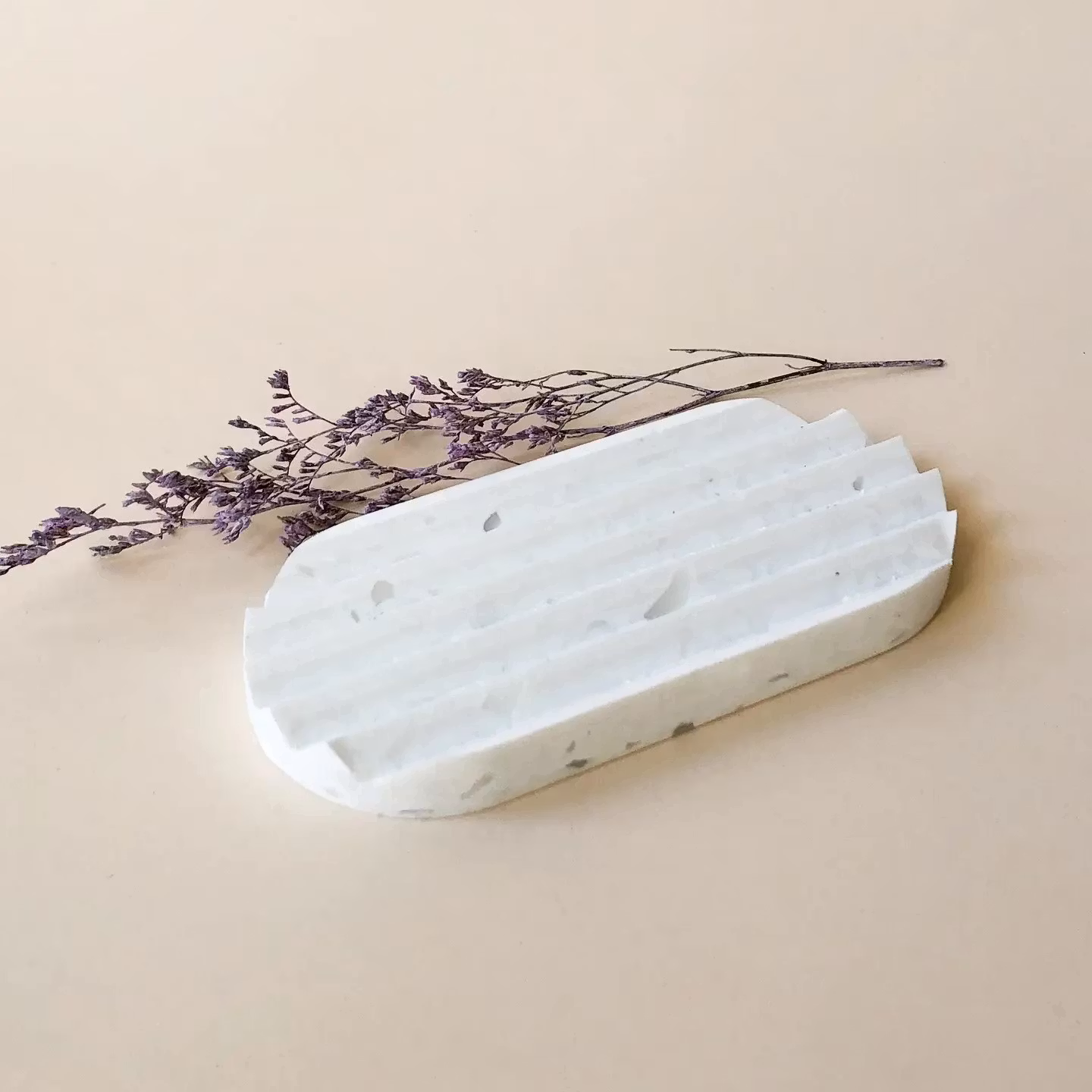 Dubbel tvålfat återvunnet, designat av svåråtervinningsbart industriellt plastavfall. Detta avfall samlas in och komprimeras. Det är ett hållbart och rötbeständigt material. Madera Makers tvålfat är designade för att dina tvålar ska sväva. Det är mycket lite kontakt mellan tvålfatet och dina tvålar, vilket möjliggör idealisk torkning. Tillverkat av återvunnen och återvinningsbar plast, med en marmorerad effekt. Helt tillverkat av återvunnet plastavfall och bearbetat lokalt. Den vita basen består av schampoflaskor. Den är beströdd med transparent postindustriellt avfall. Madera Makers återvinner alla rester från vår produktion för att återanvända dem till nya produkter. Inget går förlorat, allt återanvänds.